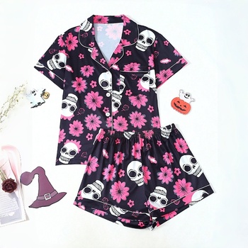 Women's Woven Cartoon Print Sleepwear Pajama Set with Short Sleeves Elastic Waist Women's Sleepwear Halloween Sleepwear